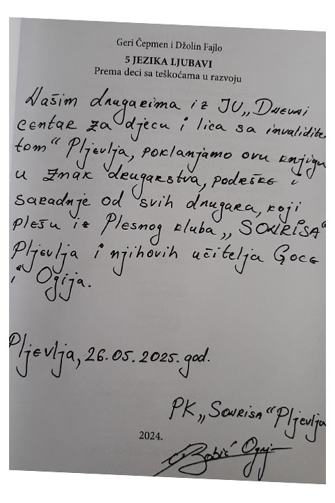 Plesni klub "Sonrisa" Pljevlja danas nas je obradovao knjigom "5 jezika ljubavi prema djeci sa teškoćama u razvoju". Hvala svim drugarima iz plesnog kluba, kao i njihovim divnim instruktorima Goci i Ognjenu na podršci, drugarstvu i ljubavi koju nam nesebično pružaju iz godine u godinu. Veliko hvala i na vašoj angažovanosti da djeca sa smetnjama u razvoju dobiju svoje mjesto u plesnom klubu "Sonrisa".